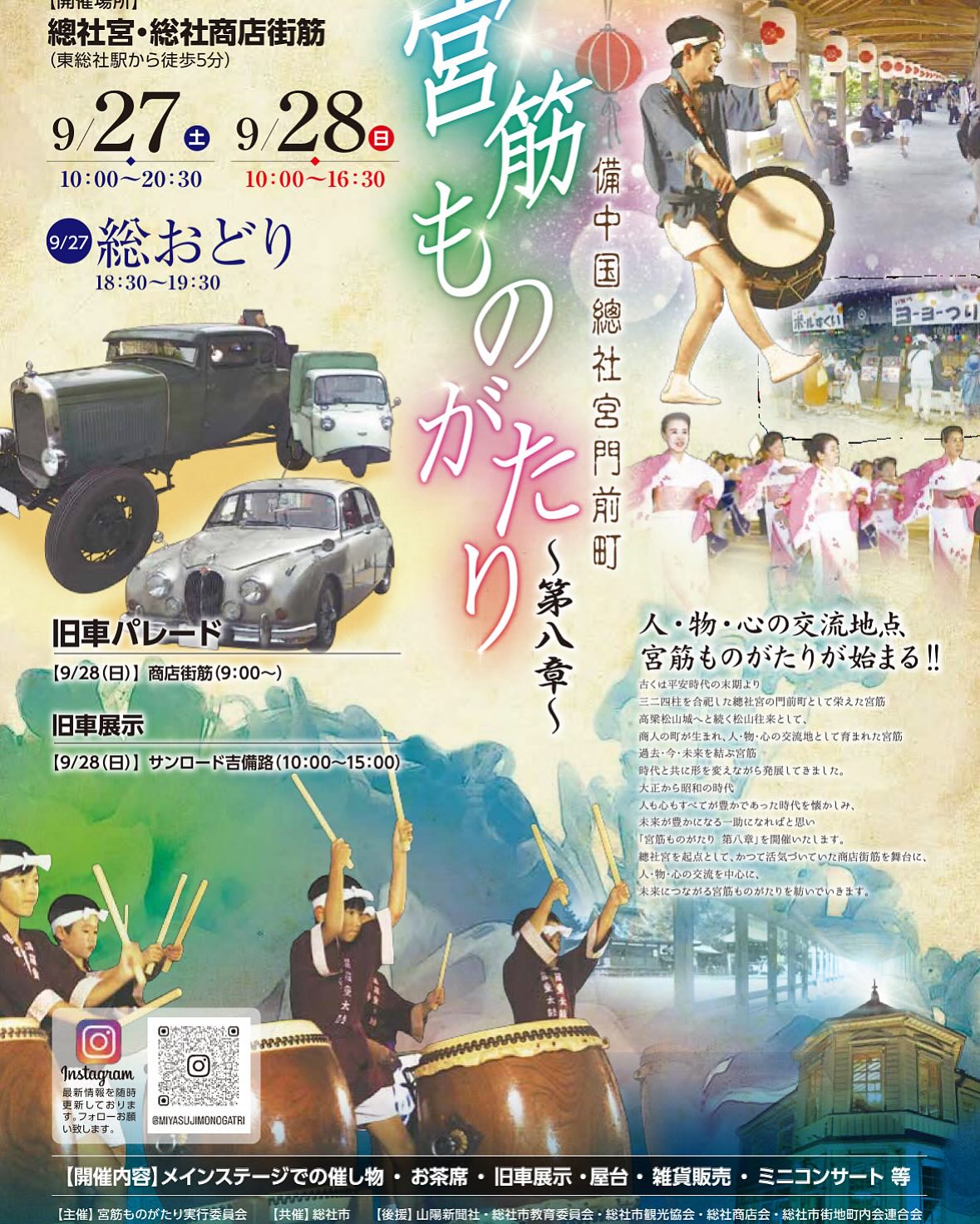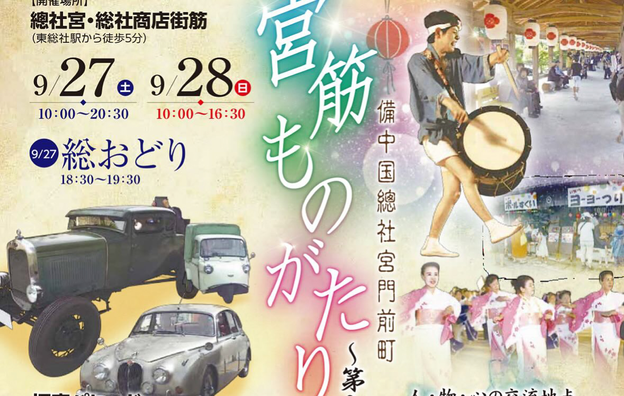 <備中国総社宮門前町“宮筋ものがたり ~第八章~”(9月27日・28日)開催!!>〜総おどり・旧車パレード&展示・お茶席・屋台・雑貨販売・ミニコンサートなど総社宮を起点に盛り上がる!!〜