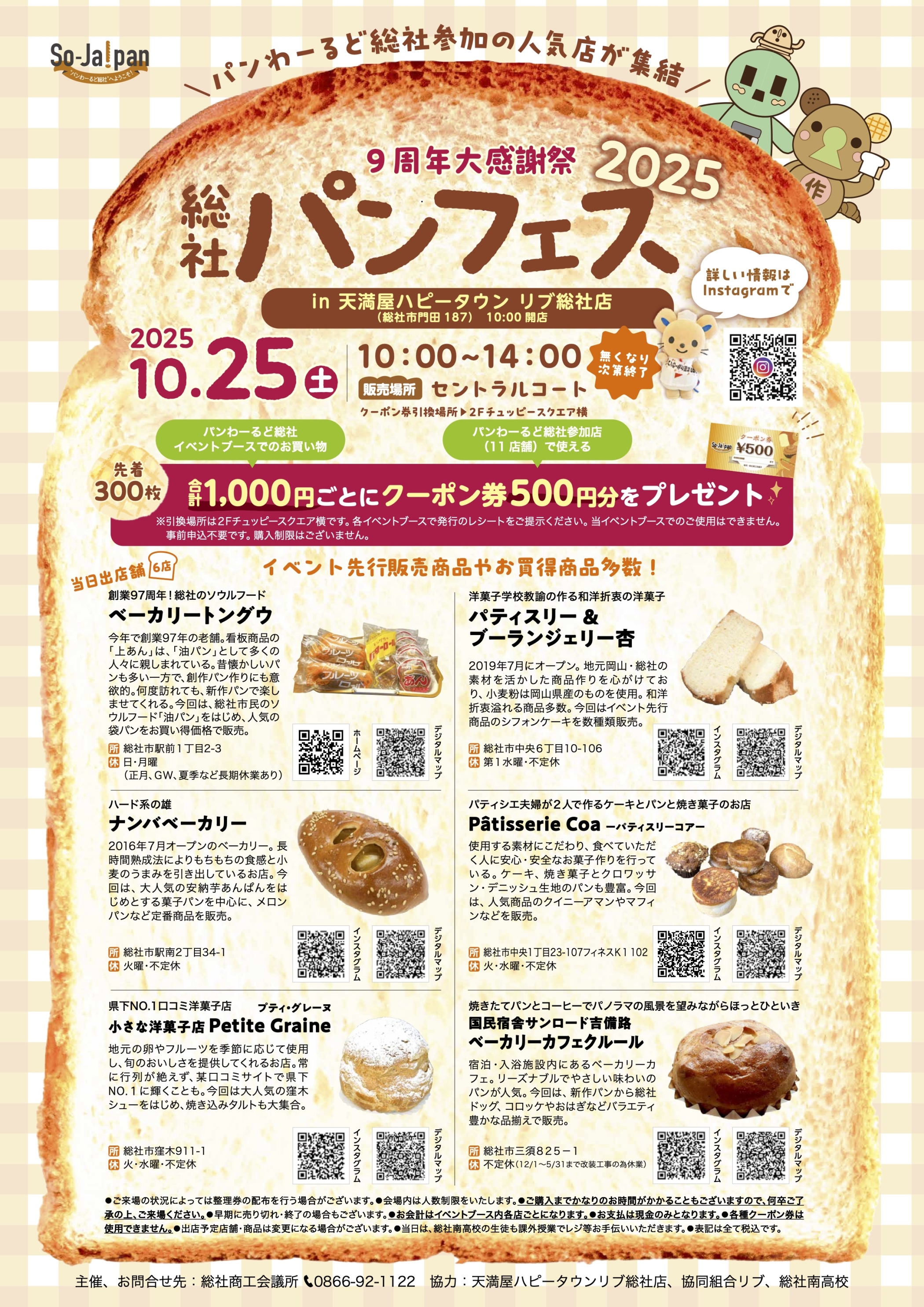 <パンわーるど総社9周年大感謝祭“総社パンフェス2025”(10月25日10:00〜14:00)開催!!>〜天満屋ハピータウンリブ総社店セントラルコートに参加店集結!! イベントブースで1,000円(税込)お買い上げごとに500円分クーポン券プレゼント!!(先着300枚)〜