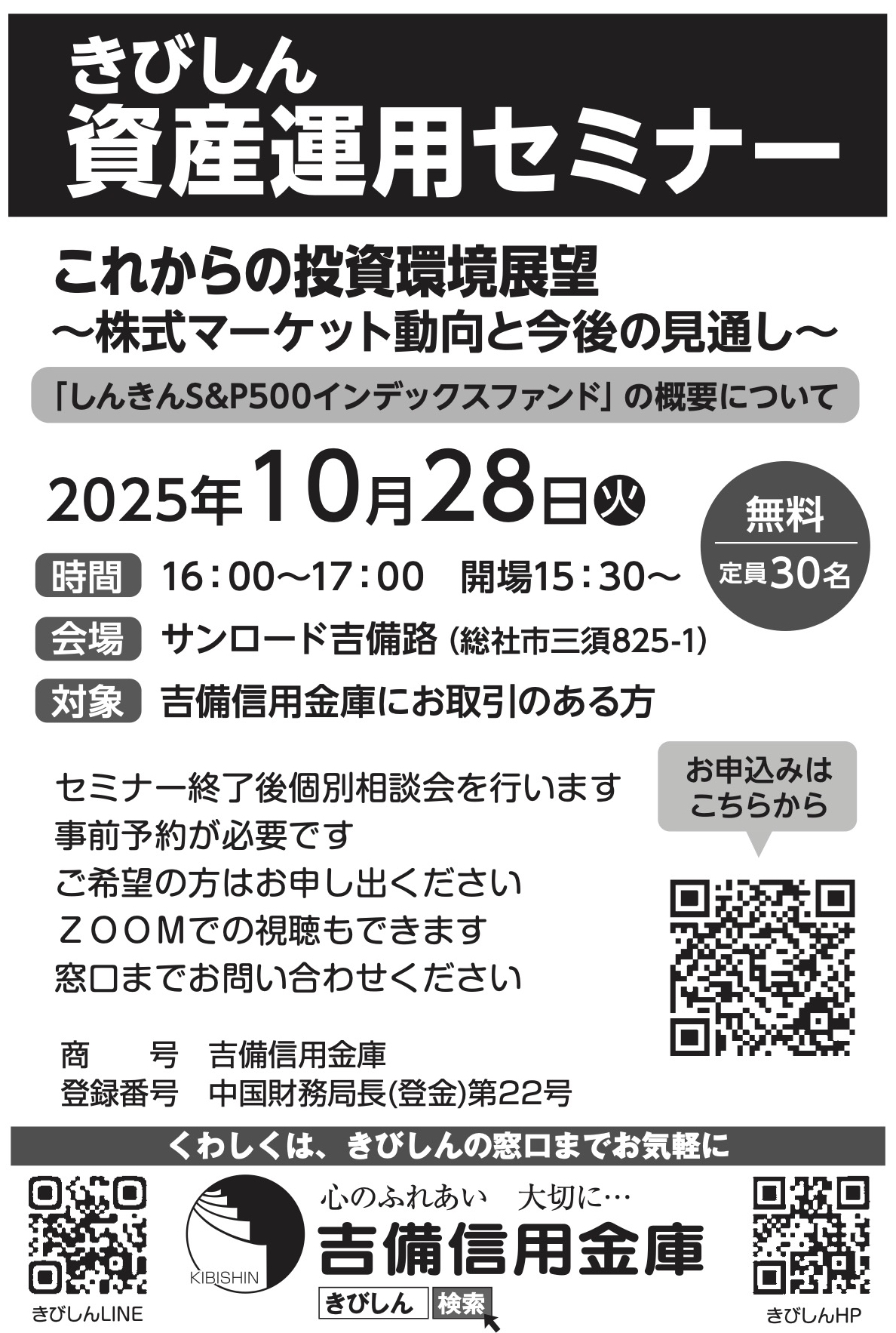 “心のふれあい 大切に...”吉備信用金庫の“きびしん資産運用セミナー”のご案内です。