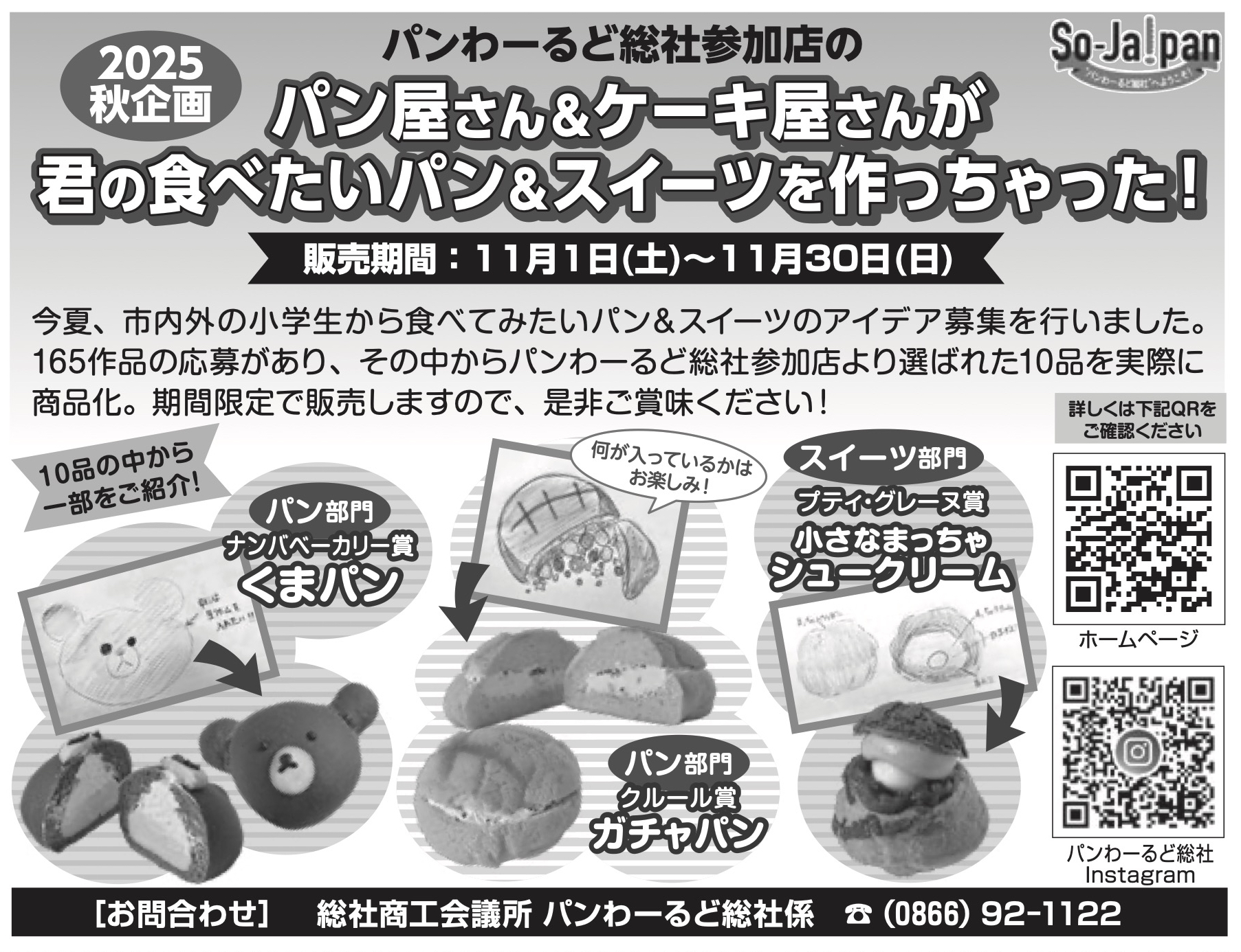 <2025秋企画“パン屋さん&ケーキ屋さんが君の食べたいパン&スイーツを作っちゃった!”>〜今夏募集した小学生が考えたパン&スイーツ10品を総社市内のお店で期間限定販売中!!(販売期間:11月1日〜30日)〜