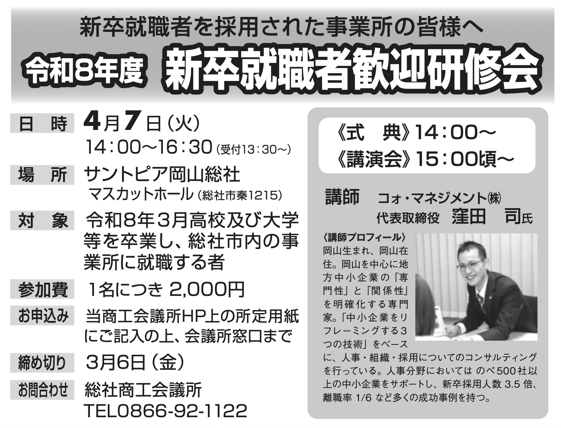 総社市内の企業へ就職する新卒者の皆さんを歓迎する“新卒就職者歓迎研修会”が、4月7日(火)14:00〜16:30(受付13:30〜)サントピア岡山総社 マスカットホールにて開催されます。