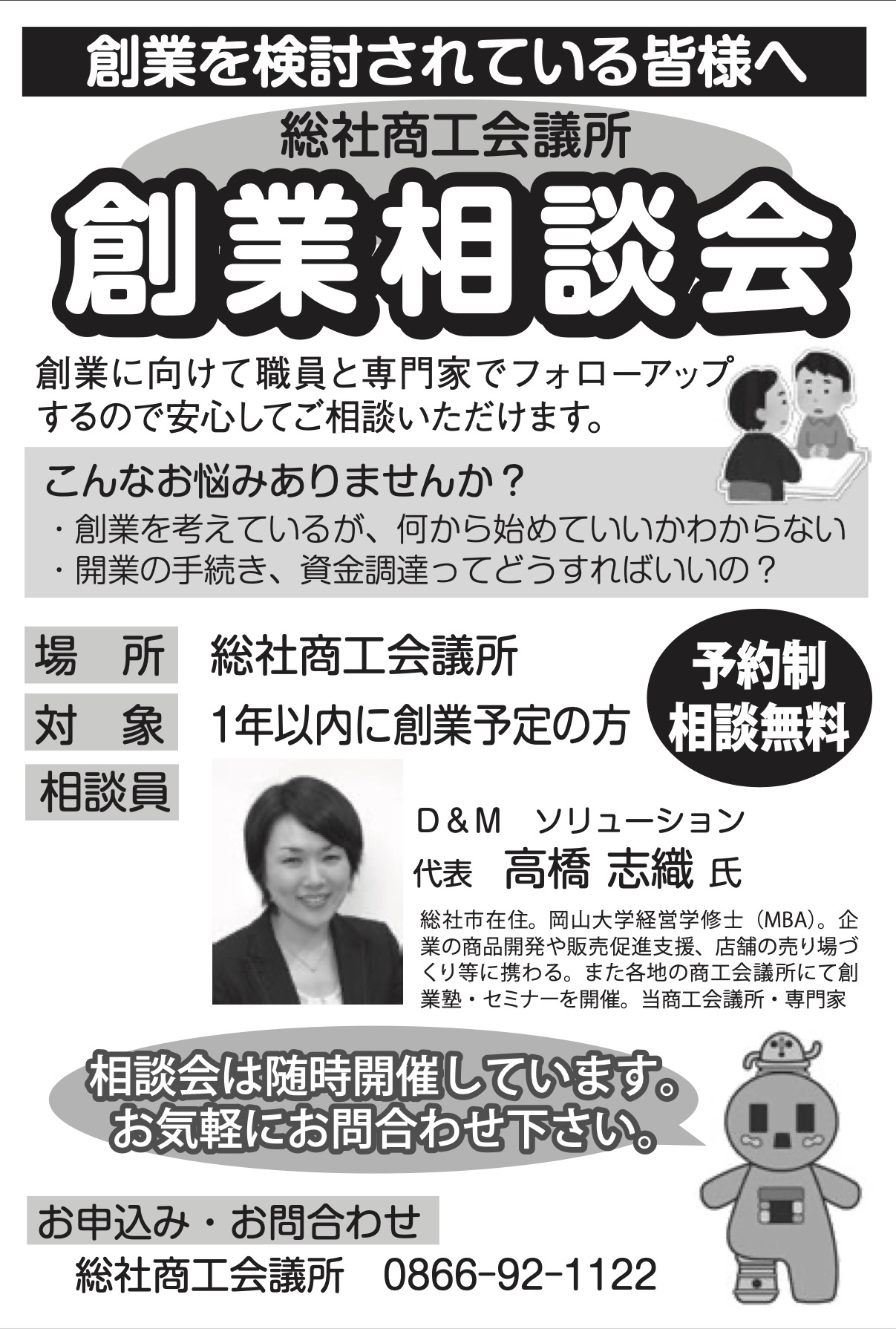 News 創業を検討されている皆様へ<総社商工会議所“創業相談会”>〜職員&専門家が“あなたの創業をフォローアップ!!” 安心してご相談いただけます。(相談無料)〜 総社商工会議所2026.02.23 総社商工会議所では、予約制で“創業相談会(相談無料)”を開催します。 創業に向けて、総社商工会議所職員と専門家でフォローアップするので安心してご相談いただけます。 創業したい方、創業を考えている方はお気軽にご参加くださいね。 D&MソリューションWEBサイトはこちら