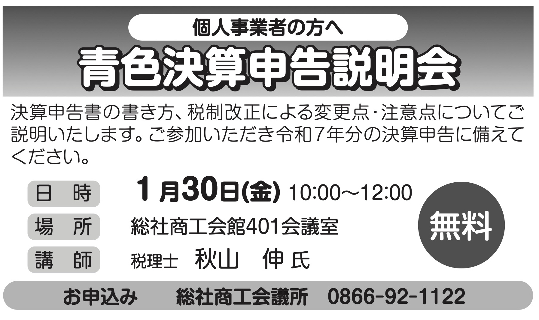 個人事業者の皆様へ<青色決算申告説明会(1月30日)開催!!>〜決算申告の書き方・税制改正による変更点・注意点をご説明!! 令和7年分の決算申告に備えましょう!!〜