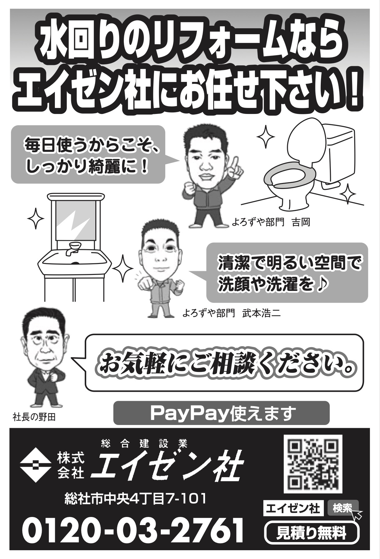 株式会社エイゼン社<“水回りリフォーム”もおまかせ!!>〜トイレや洗面・キッチン・お風呂“そろそろリフォームしたいな〜”そんな方は安心・安全・実績のエイゼン社にお気軽に!!(PayPayも使える!!)〜