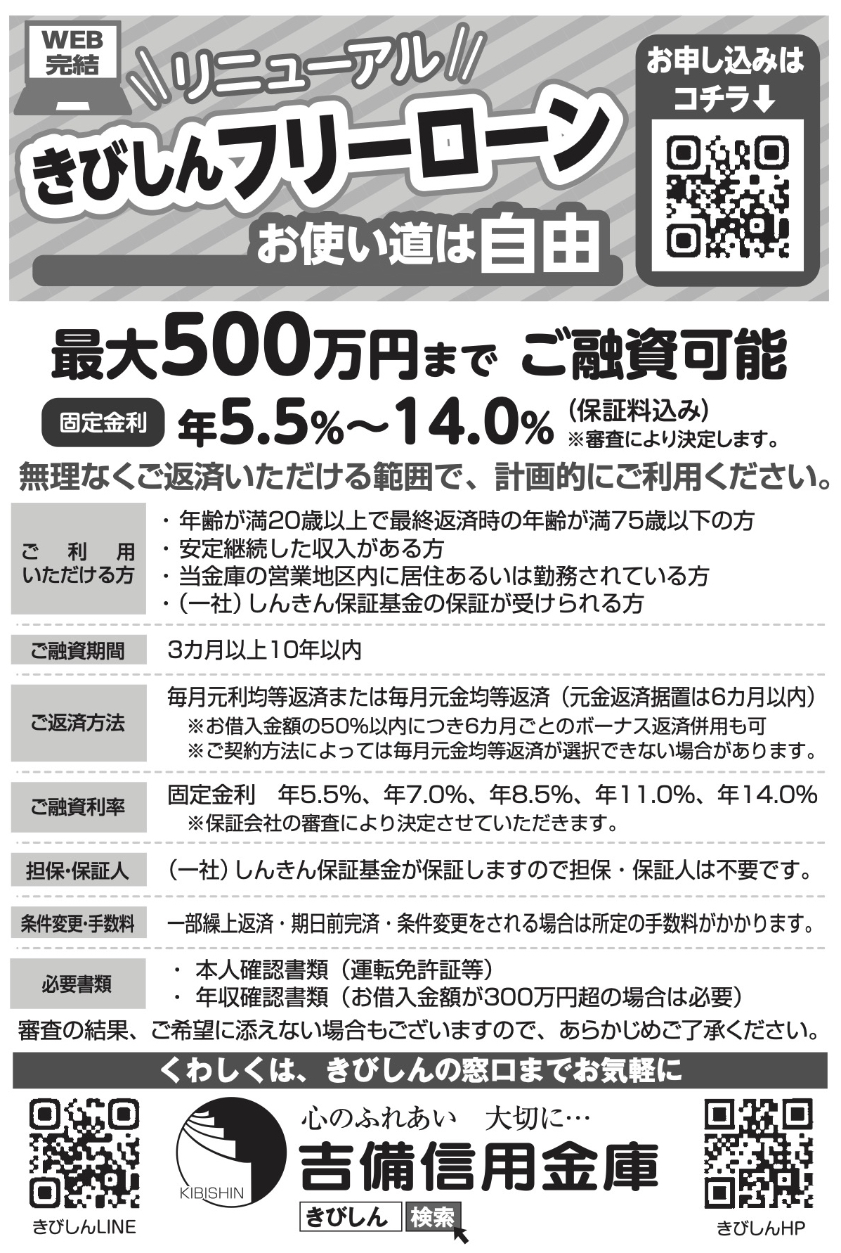 きびしん<“きびしんフリーローン”リニューアル!!>〜使いみち自由!! お申し込みからご融資まで“WEBで完結!!”ご融資金額最大500万円まで(固定金利:年5.5〜14.0%)〜