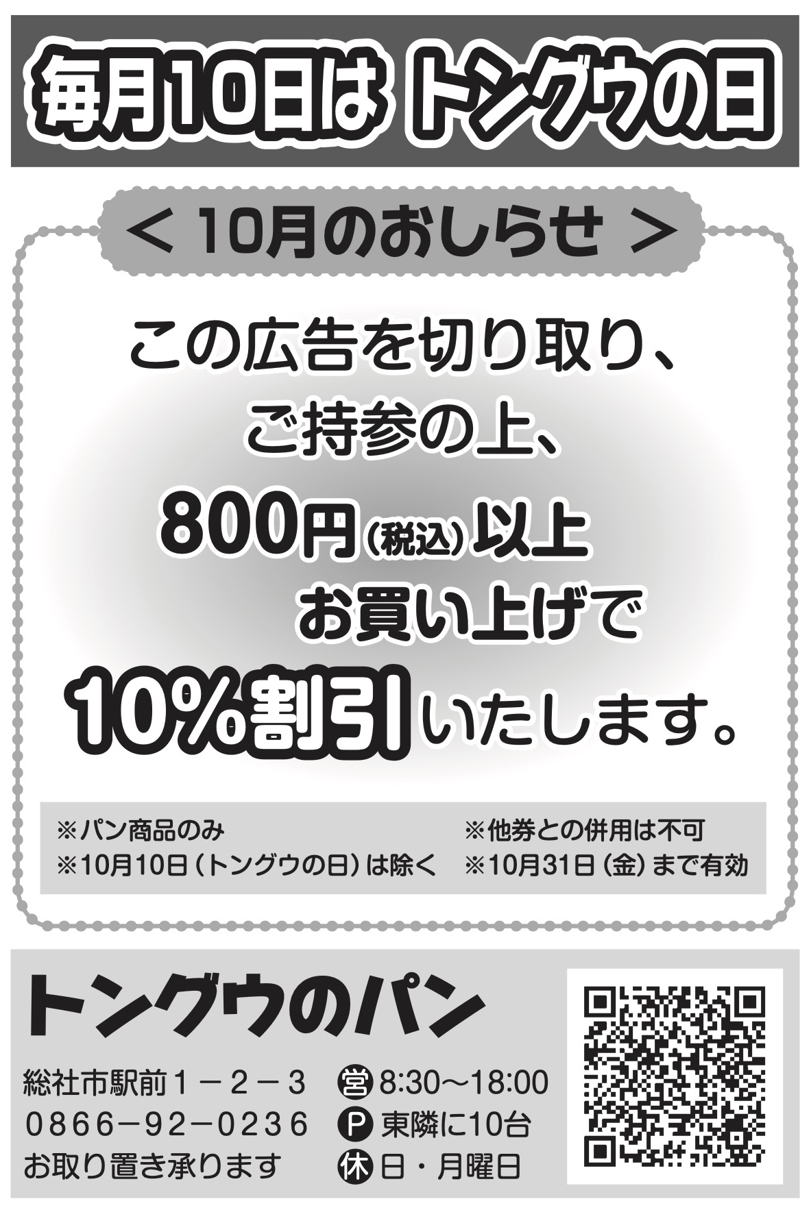 ベーカリー トングウ<“10%割引”切り取り広告掲載!!>〜10月1日発行の商工ニュースをチェック!! 800円(税込)以上お買い上げで“10%割引”お見逃しなく!!(トングウの日は9日!!)〜
