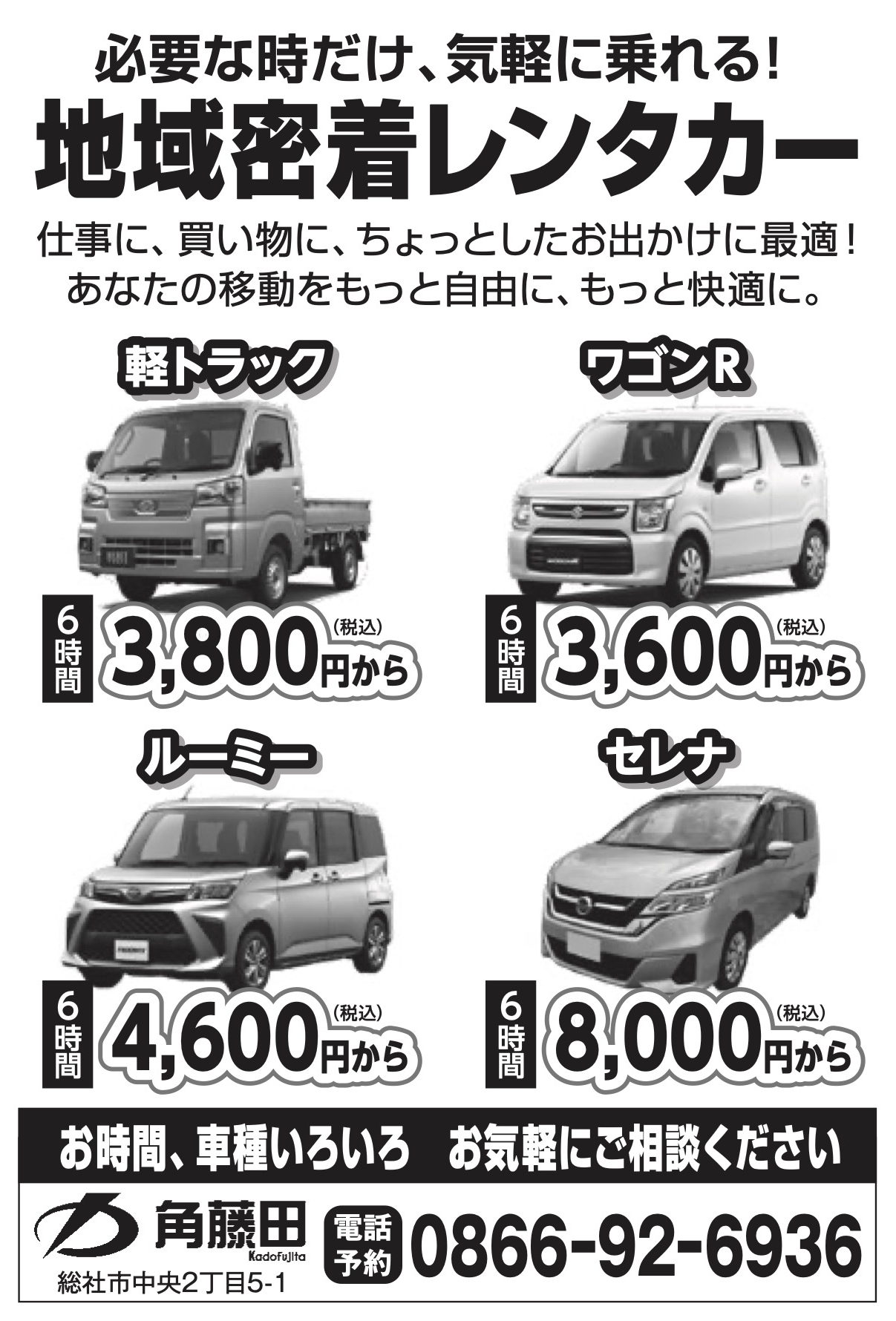 エネルギー・生活関連の総合商社 株式会社 角藤田さんの必要な時だけ気軽に乗れる!!“地域密着レンタカー”のお知らせです!!