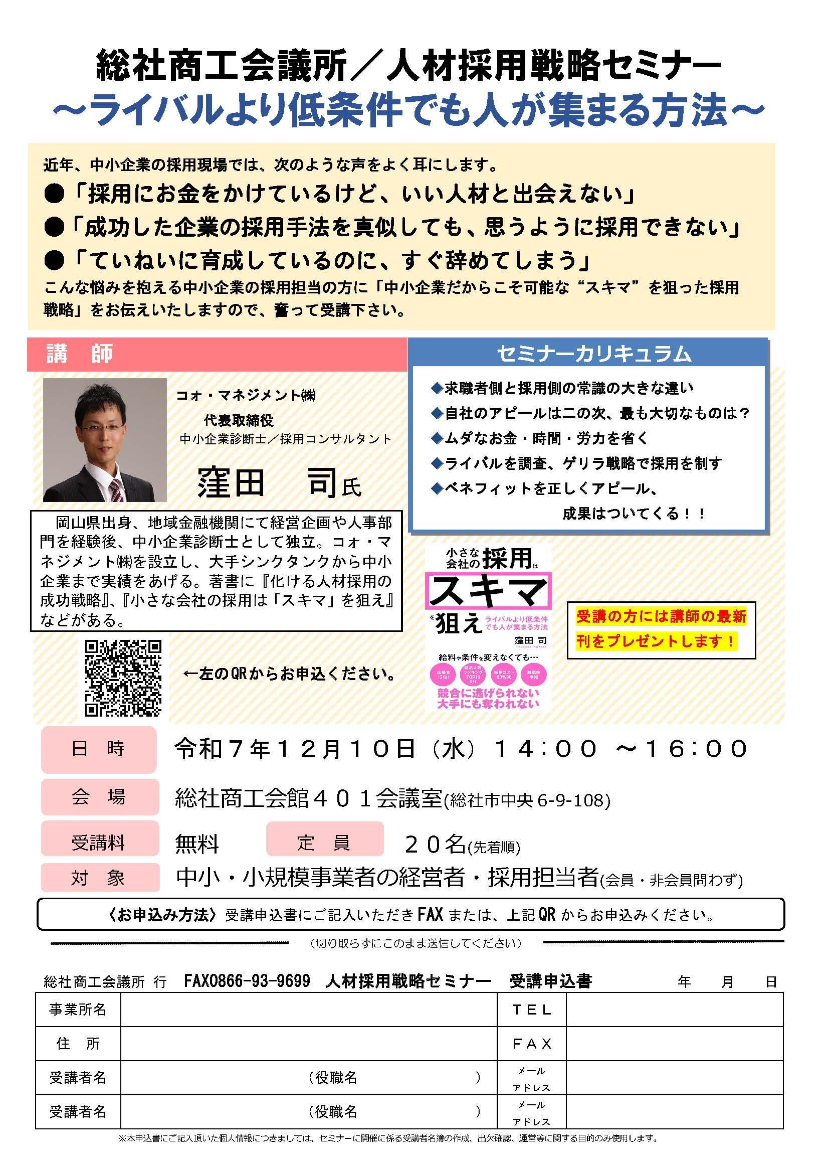 この“人材採用戦略セミナー”は、そんな悩みを抱える中小・小規模事業者の方や採用担当者向けの講座でライバルより低条件でも人が集まる方法が学べます。 ぜひご参加くださいね!!