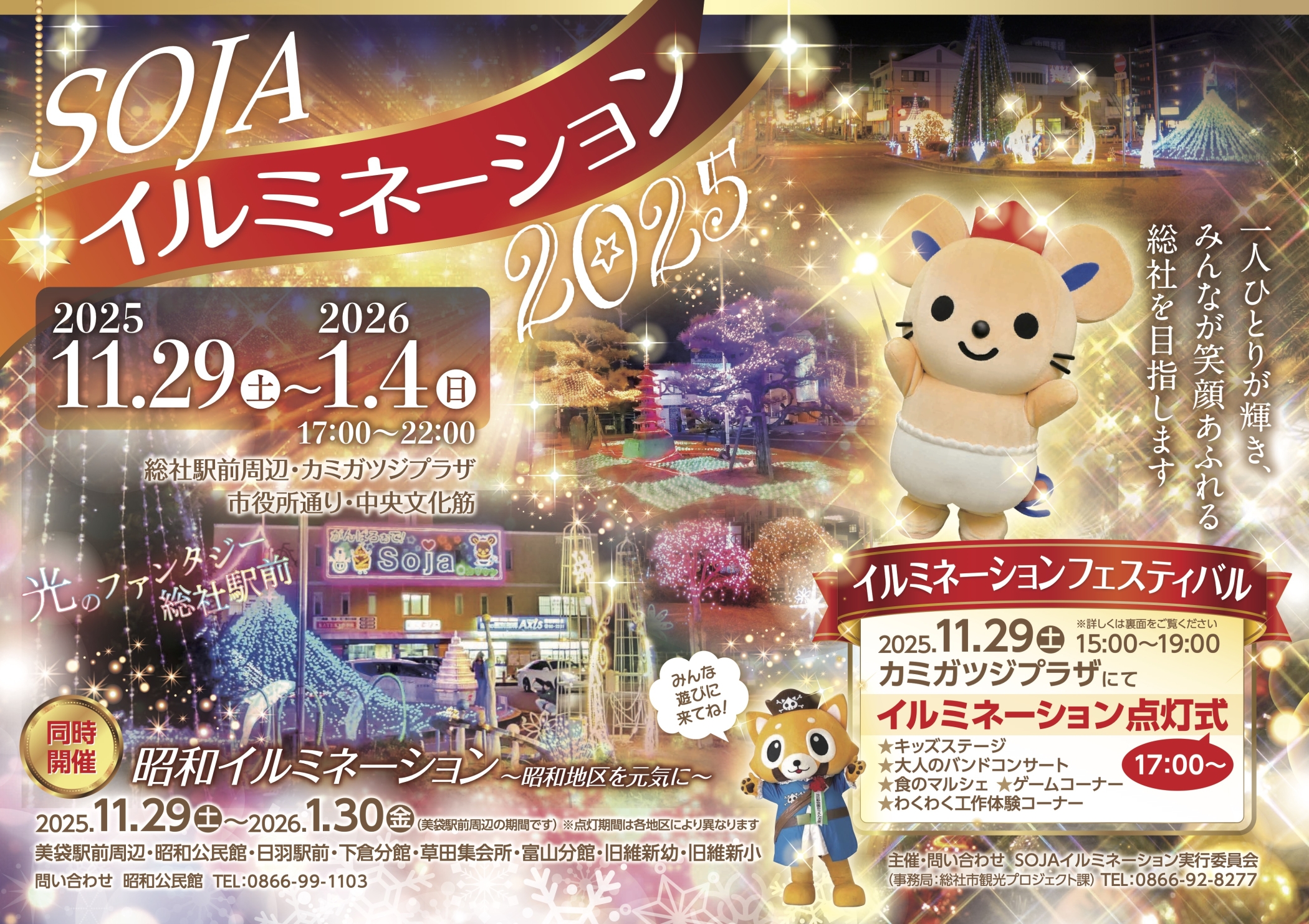 <“SOJAイルミネーション2025”(11月29日〜1月4日まで)>〜“総社駅前・市役所通り・中央文化筋・市役所・カミガツジプラザ他”総社のまちをあたたかな光が彩ります!!